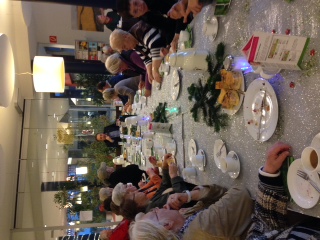Bei einer weihnachtlich geschmückten Tafel, Kaffee, Tee,, Glühwein und Kuchen gelangen viele Gespräche untereinander, aber mit den Abgeordneten Katharina Fegebank und Farid Müller.