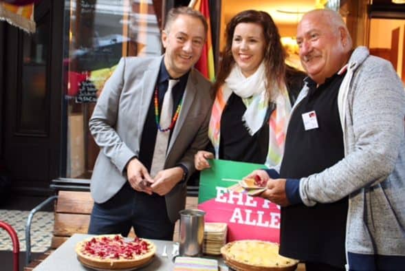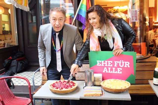 Von der „Hamburger Ehe“ zur „Ehe für Alle“: Anna Galina (Grüne Landesvorsitzende) und ich haben das am Freitagmorgen vom Bundestag beschlossende Gesetz vor dem Cafe Gnosa gefeiert.Der Gesetzentwurf wurde 2015 u.a. von den Bundesländern Rheinland-Pfalz und Hamburg in den Bundesrat eingebracht und wurde damals mit großer Mehrheit im Bundesrat beschlossen. Seitdem schmorte das Gesetz im Rechtsausschuss des Deutschen Bundestages, ohne Entscheidung der Großen Koalition aus SPD und CDU/CSU.