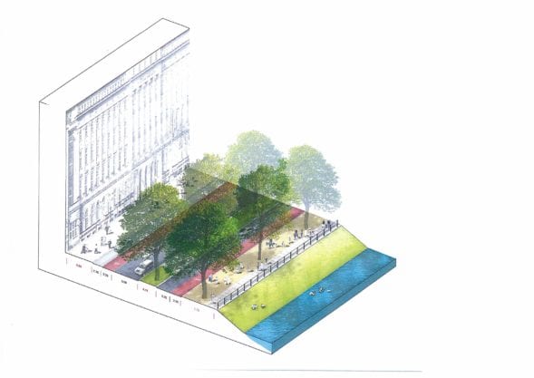 Nach monatelangen Verhandlungen mit der SPD im Bezirk und am Ende auch auf Landesebene, sind am 4. August nun die Planungen für den neuen Ballindamm vorgestellt worden: Mit einem 7 Meter breiten Bürgersteig zur Wasserseite bekommen Fußgänger mehr Platz. Die aktuell sehr schmalen und im schlechten Zustand befindlichen Radwege werden zu Fahrradspuren (auch breiter) auf der Straße. Es soll nur noch eine Fahrbahn in Richtung Rathaus und eine breitere Fahrbahn city-auswärts geben, die in der Rushhour auch als Doppelfahrbahn genutzt werden kann.