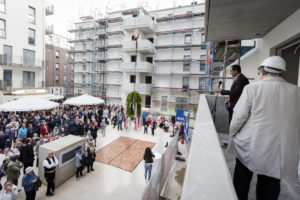 Viele zukünftige Bewohnerinnen und Bewohner waren zum Richtfest gekommen, aber auch der Kulturladen St. Georg sowie viele Akteure aus dem Stadtteil selbst. Schon jetzt ist das Interesse an diesem neuen Quartier groß.