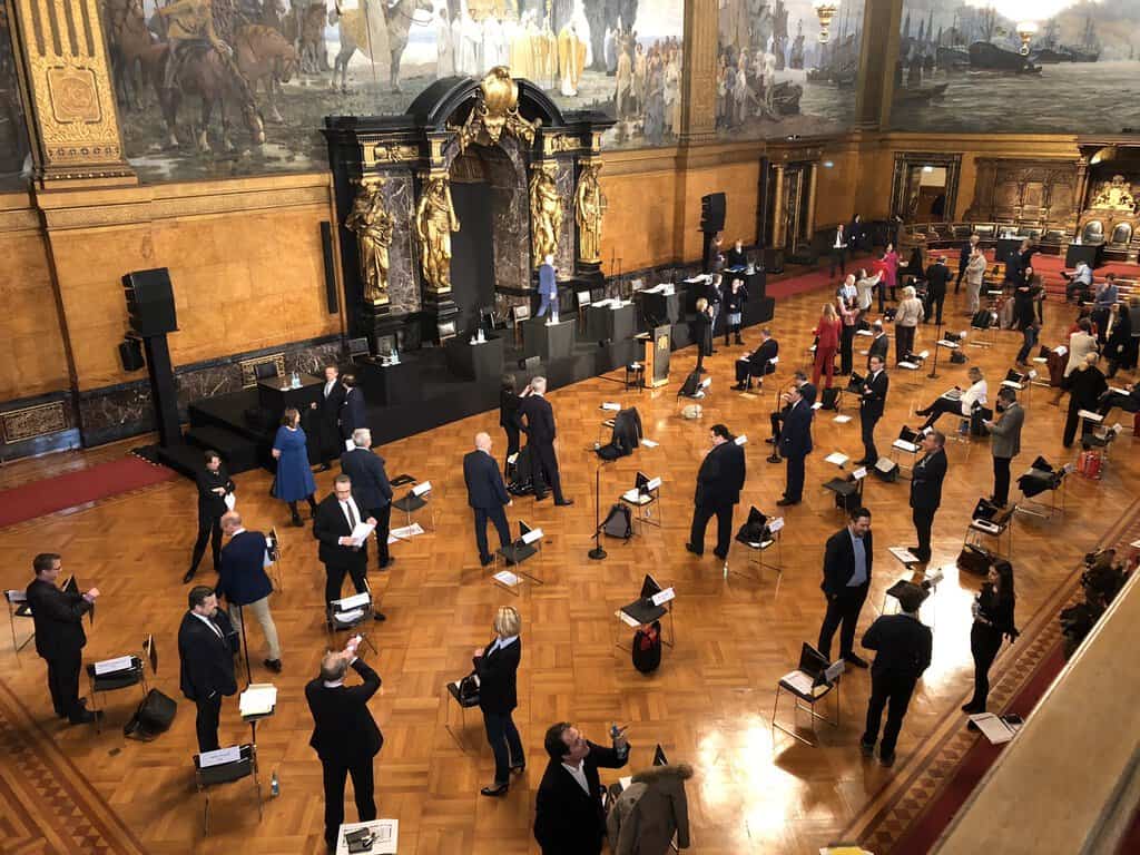 Damit wir Abgeordnete den geforderten Mindestabstand von 1,50m einhalten, ist der Plenarsaal in den Großen Festsaal verlegt worden, den wir ja alle eher vom Neujahrsempfang her kennen…