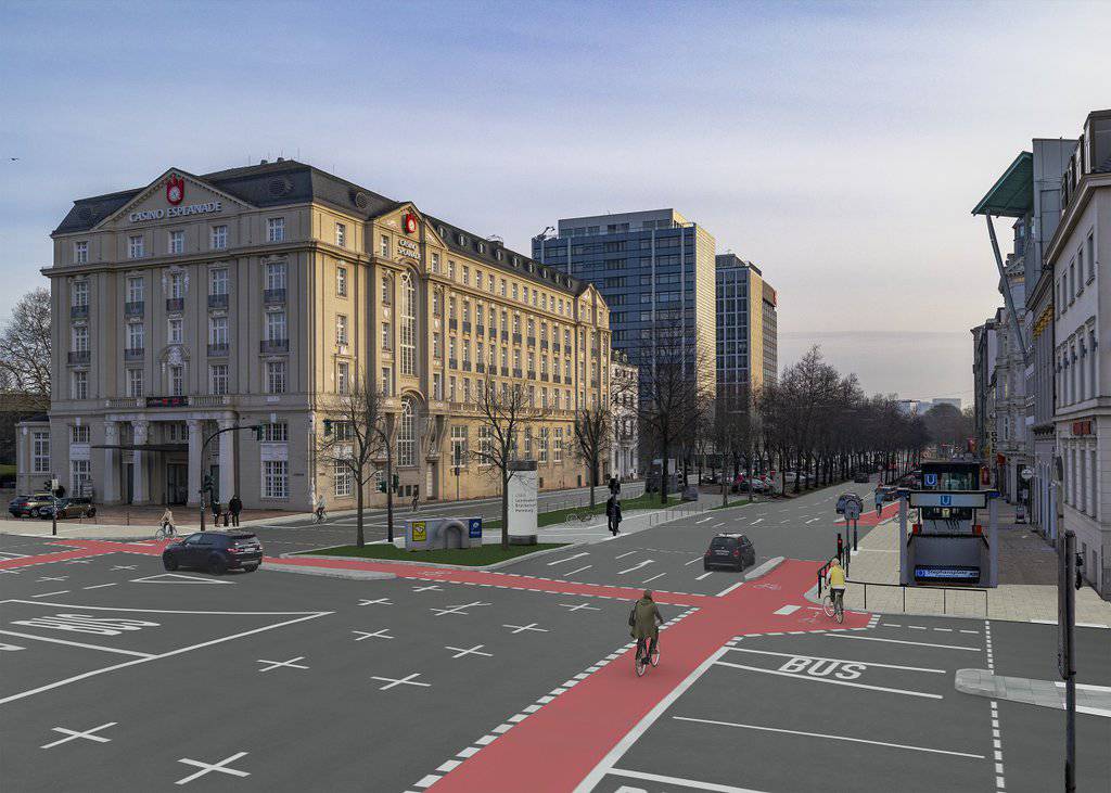 Bislang gab es in Hamburg noch keine dieser geschützten Radwege, weitere sind in der Hannoverschen Straße in Harburg geplant. Mit bisher 38.000 Autos täglich ist die Esplanade ein Verkehrs-Hotspot in der City – und kann jetzt dank sicherer Radwege und breiterer Bürgersteige auch ein Hotspot für den Rad- und Fußverkehr werden. Auf der Südseite wird daher eine Fahrspur zugunsten dieser Verbesserungen wegfallen.