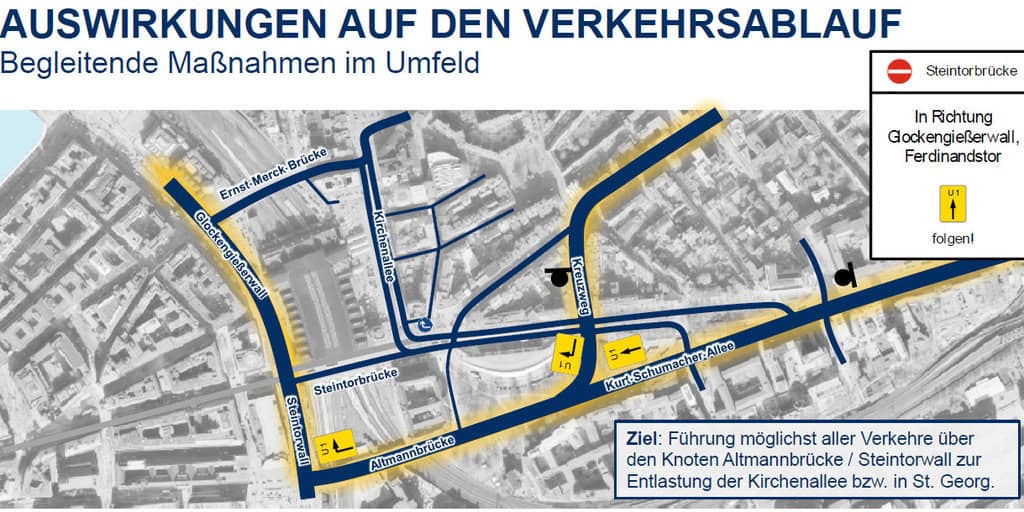 Das soll sich nun ändern. Die Hochbahn plant auf der Steintorbrücke ein Pendant gegenüber der bestehenden. Um Platz für diese Haltestelle zu gewinnen, und trotzdem noch den Fuß- und Radverkehr zu gewährleisten, wird Richtung Innenstadt der Autoverkehr rausgenommen, und allein auf eine Busspur plus verbreiterte Fuß- und Radwege gesetzt. Die Alternativroute für den Autoverkehr soll dann im Süden die parallellaufende Altmannbrücke werden.